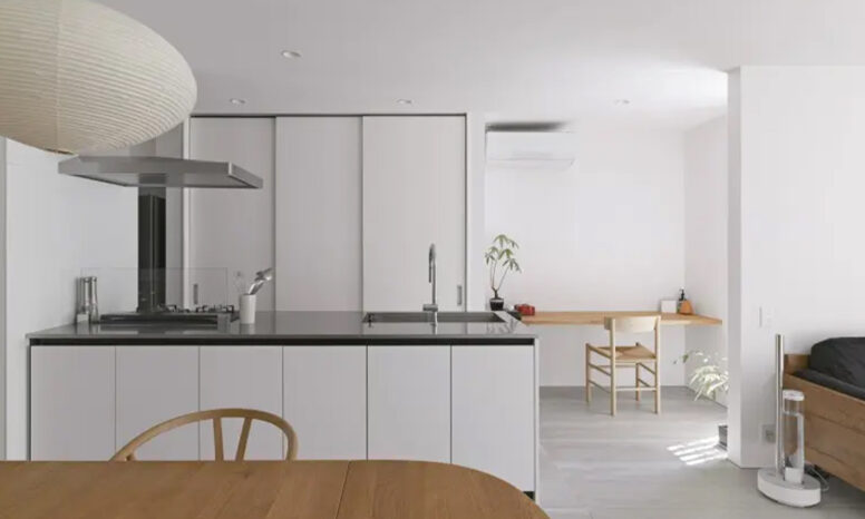 キッチンのグレーのタイルや、洗面台の実験用シンク、和モダンの建具など、